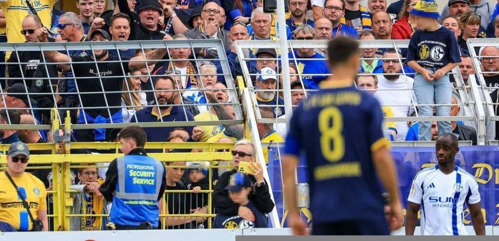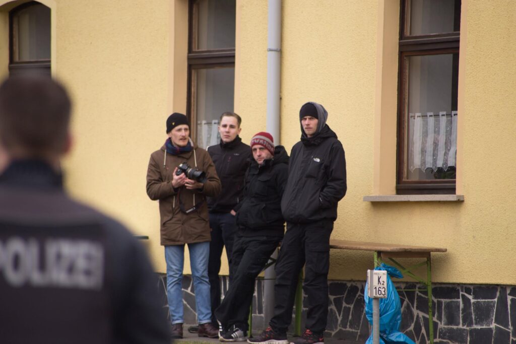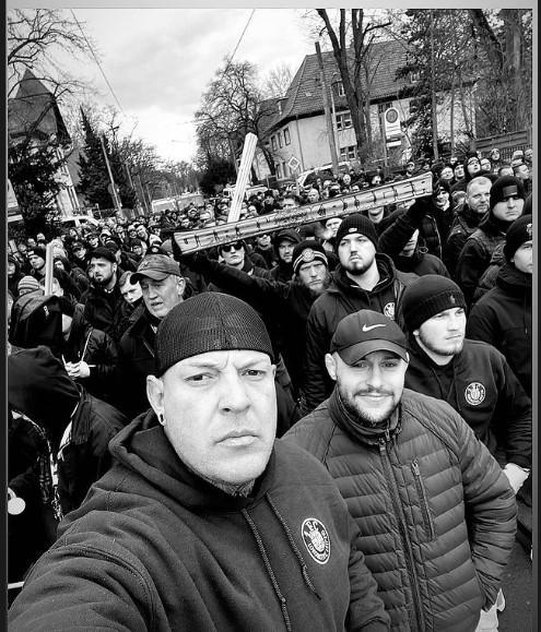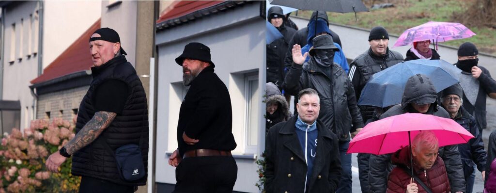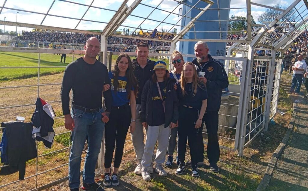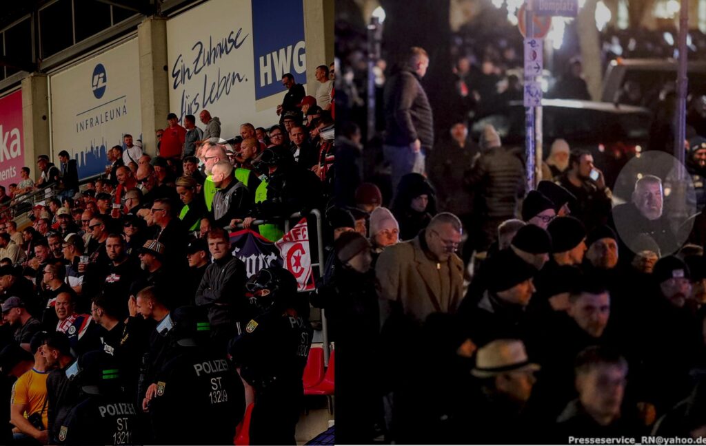 Doch muss nicht in das vergangene Jahr geblickt werden, um Neonazis im Bruno-Plache-Stadion auszumachen. Die Pressefotos vom DFB-Pokal Spiel im August 2025 reichen dafür aus. Hinter Lukas Müller steht mit Kay Schrader ein Neonazi aus Sachsen-Anhalt, für den der Besuch beim revisionistischen „Trauermarsch“ in Dresden einen festen Termin darstellt. Mindestens in den Jahren 2023, 2024 und 2025 nahm er an dem Naziaufmarsch teil.