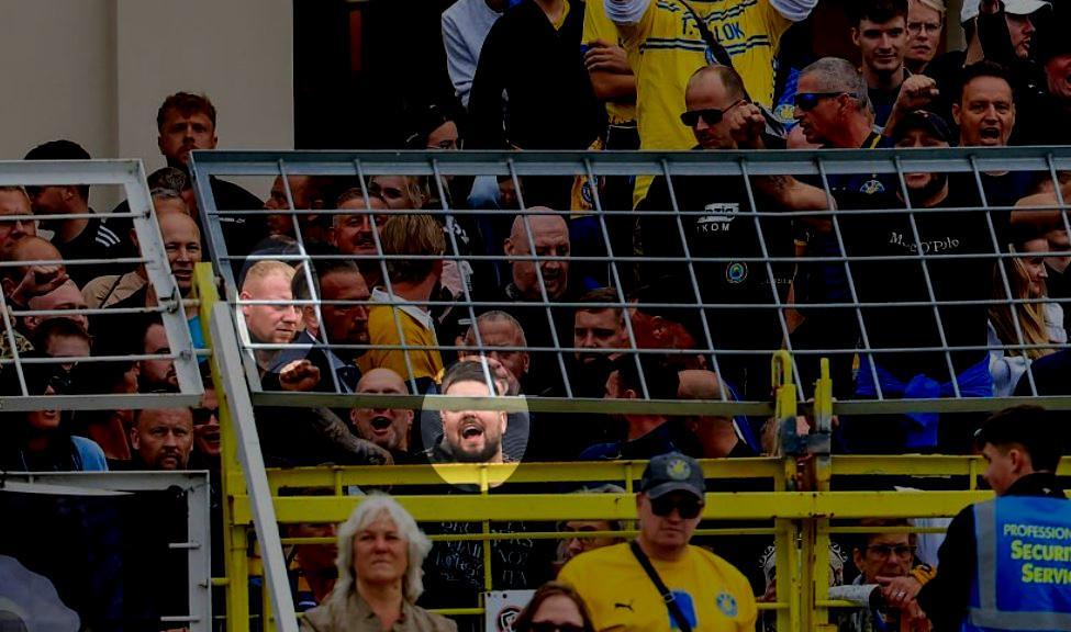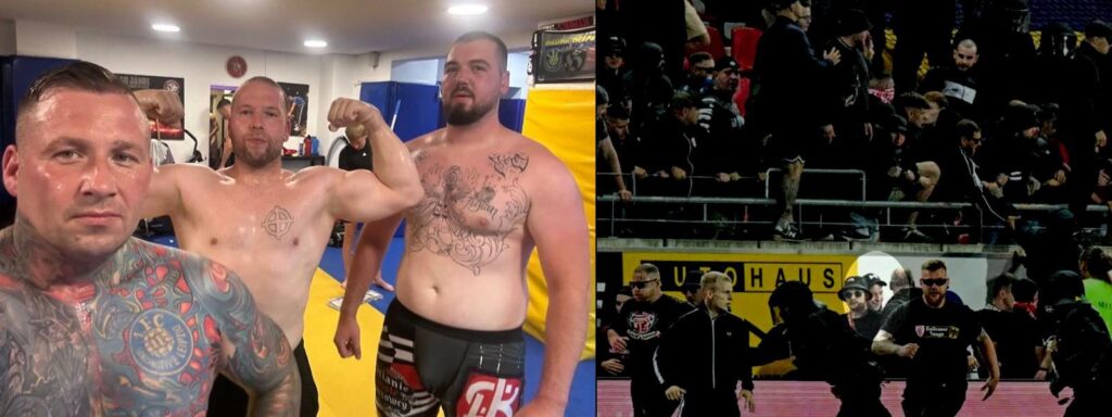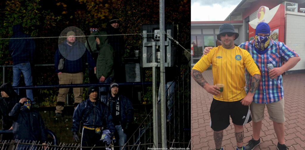 Mit Benjamin Brinsa ist einer ihrer prominentesten Vertreter und bis heute tonangebenden Figuren der neonazistischen Fanszene ebenso in der Bildmitte zu sehen, wie Andreas oder Dittmar Schumer. Die eineiigen Zwillinge fielen in der Vergangenheit immer wieder mit schweren rechten Gewalttaten auf und waren neben „Scenario Lok“ auch Teil von Brinsas „Imperium Fight Team“ (IFT). Wenige Stufen näher am Feld und in unmittelbarer Nähe zu Antwi-Adjei animiert im Moment der Aufnahme der notorische Neonazi und Hooligan Thomas Kuhbach den Block. Auch Kuhbach, der den Schriftzug „Scenario Lok Hooligans“ oberhalb der Brust tätowiert hat, posierte in der Vergangenheit auf Bildern das „Boxclub Lokomotive“, der Vorgängerstruktur des IFT.