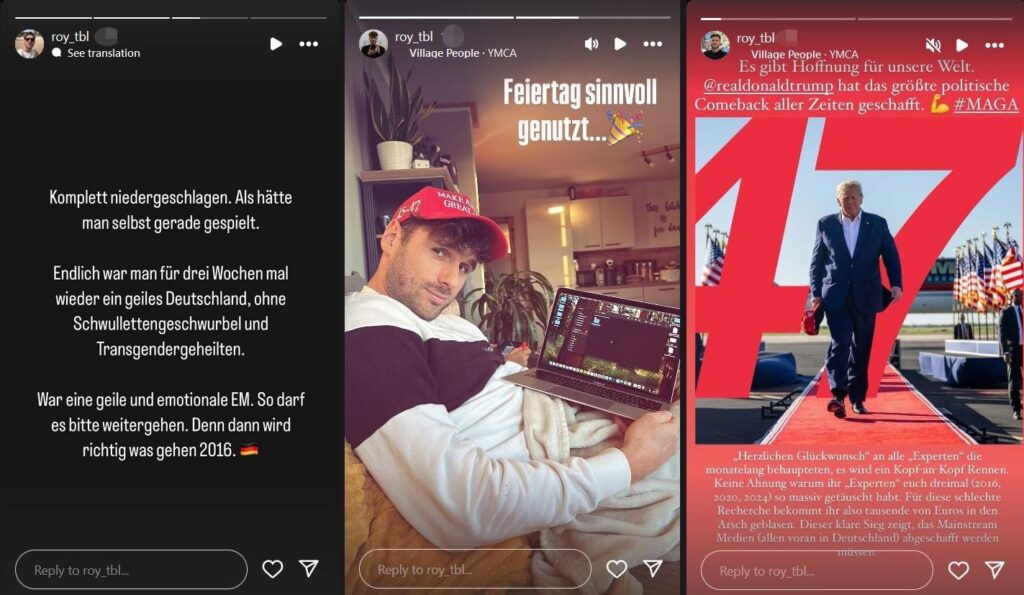 Zwischenzeitlich war Treibl als Twitch-Streamer aktiv und distanzierte sich 2021 dort in wenigen Worten von Rassismus. Lange hielt dieses Lippenbekenntnis jedoch nicht. Im November 2024 posierte er kurz nach dem Wahlsieg Donald Trumps mit einer roten „Make America Great Again“-Cap. In einer Instagram-Story bezeichnete er ihn als „Hoffnung für unsere Welt“ und befand, dass die „Mainstream-Medien abgeschafft werden müssen“. Im nationalen Taumel befand sich Treibl auch nach der Europameisterschaft 2024, bei der man laut Treibl für ein paar Wochen wieder ein „geiles Deutschland ohne Schwulettengeschwurbel und Transgendergeheilten“ genießen durfte.