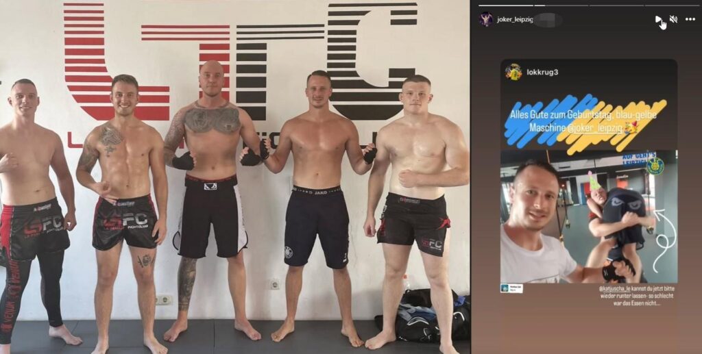 Krug und Fritzsch eint neben ihrer Fußballerbiographie die Affinität zum Kampfsport. Markus Krug ist regelmäßiger Gast im Halleschen „La Familia Gym“, das in der Vergangenheit wiederholt wegen seiner neonazistischen Verstrickungen in der Kritik stand. Davon unberührt, teilt sich Krug in diesem Gym mit ausgemachten Neonazis die Matte. Im Juli 2022 posierte er etwa mit Dominic Exel aus Halle nach einer gemeinsamen Trainingseinheit. Exel trat wenige Jahre zuvor beim neonazistischen Kampfsportevent „TIWAZ“ als Kämpfer an und ist auf diversen Neonazi-Aufmärschen in Erscheinung getreten. Nicht nur als Trainingspartner, sondern auch freundschaftlich ist Krug außerdem mit dem Leipziger Kampfsportler Christopher Henze verbunden. Henze, ebenfalls zu „Scenario Lok“ gehörig und Teil des koordinierten Angriffs auf Connewitz im Jahr 2016, war neben Brinsa die zentrale Figur im IFT und ist bis heute prägend in der neonazistischen Kampfsport- und Hooliganszene von Lok Leipzig. Seit dem vergangenen Jahr betreibt Henze mit den rechten Hooligans Theo Weiland (Rot-Weiß Erfurt) und Hans Krüger (FC Energie Cottbus) das „Gladiator Gym“ in Halle. Zuvor traininerte Henze regelmäßig beim „La Familia Gym“ in Halle, wo er die Freundschaft zum ehemaligen Lok-Kapitän Krug pflegte. Dass die Sympathie beidseitig vorhanden ist, zeigen unter anderem Geburtstagsgrüße von Krug an die „blau-gelbe Maschine“ Henze.
