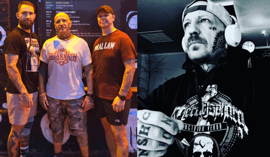 Es überrascht hier wenig, dass alle genannten Mitglieder von „Wardon 21“ regelmäßig und bundesweit Teilnehmer von nicht-rechten Hardcore-Shows sind. Bilder in den sozialen Netzwerken zeigen etwa Philipp Oertel mit Heiko Drews aus Spremberg (Brandenburg) und Mario Kleibert – beide langjährig aktive Neonazis – im Rahmen eines Konzerts von „Earth Crisis“ im Juli 2024 im „Cassiopeia“ in Berlin-Friedrichshain. Drews, der zudem den rechten Rockern des „Gremium MC Spremberg“ angehört, war auch im März 2025 bei einem Hardcore-Konzert mit „Agnostic Front“ und u.a. „Speed“ im Dresdner Club „Tante Ju“ zu Gast. Und, wie zu erwarten, im April 2025 im „Felsenkeller“ in Leipzig, als dort eine seiner Lieblingsbands, die Vegan-Straight Edge-Band „XDestroy BabylonX“, auftrat. Zur Einordnung: Drews war einst selbst Musiker in nicht-rechten Hardcore-Bands in Brandenburg (u.a. „Roodmass“) gleichwohl er ideologisch gefestigt ist. Auf seinem Körper ließ er sich das Motiv der „Schwarzen Sonne“ und der „Leibstandarte Adolf Hitler“ stechen, wie auch die Unterschrift von Adolf Hitler. Ausgestiegen ist er nie, auch wenn er beteuert weder rechts noch links zu sein und die offensichtlichen Neonazi-Symbole mit großflächigen schwarzen Tattoos überdeckt sind.