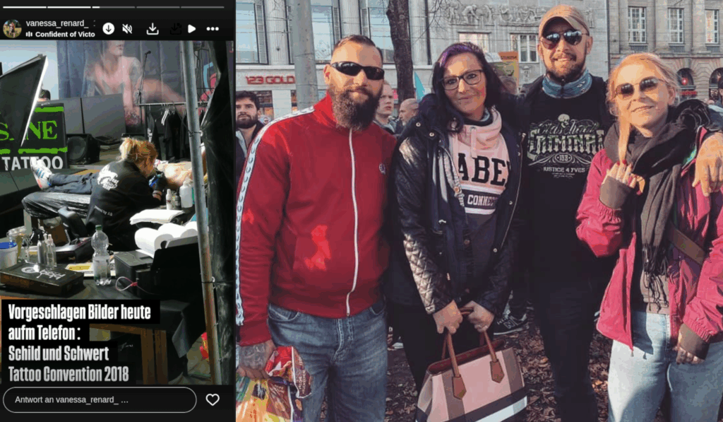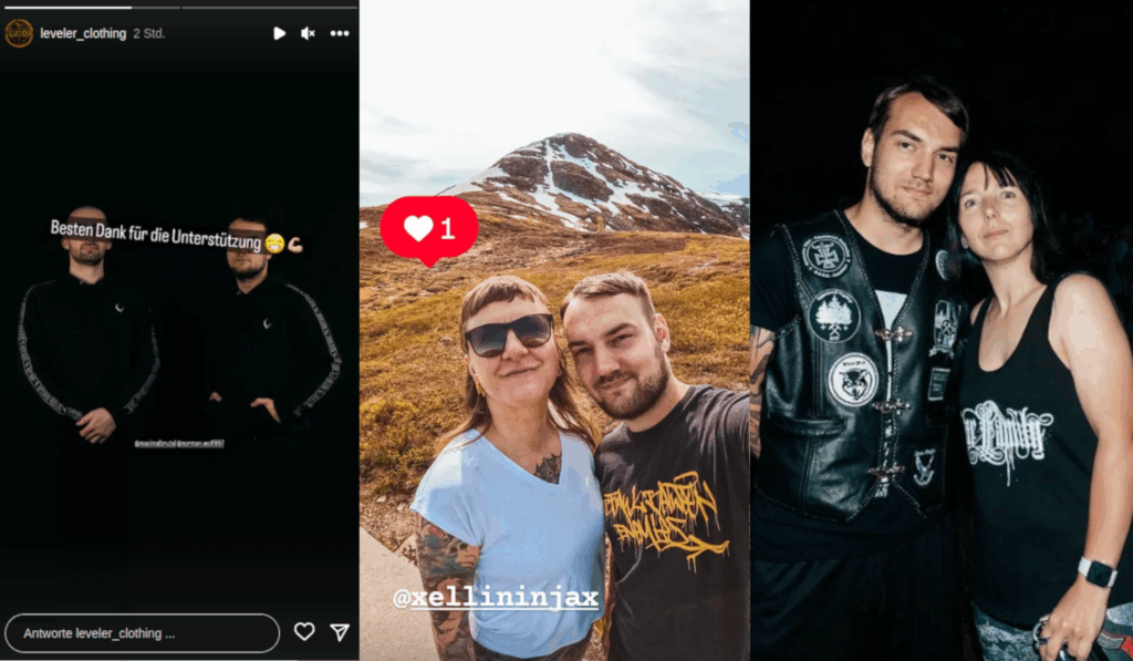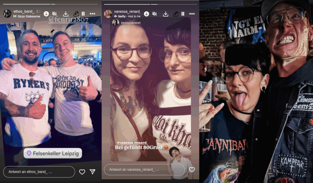 Abseits von Feiern im privaten Neonazi-Kreis, sind Vanessa Hänisch und „Kennyvonowl“ in Leipzig auch auf Metal-Konzerten anzutreffen. Ein Bild aus den sozialen Netzwerken zeigt „Kennyvonowl“ etwa auf einem „Cannibal Corpse“-Konzert im „Felsenkeller“ im Oktober 2024, posierend mit dem langjährig in der rechten Fanszene des 1. FC Lokomotive Leipzig aktiven Istvan Repaczki. Auch der Veranstaltungsort „Hellraiser“ in Leipzig-Engelsdorf ist ein beliebtes Ausflugsziel der Clique um Vanessa Hänisch. Gemeinsam mit „Kennyvonowl“ war sie dort im Januar 2024 zu Gast bei einem Konzert der Deathcore-Band „Slaughter To Prevail“.