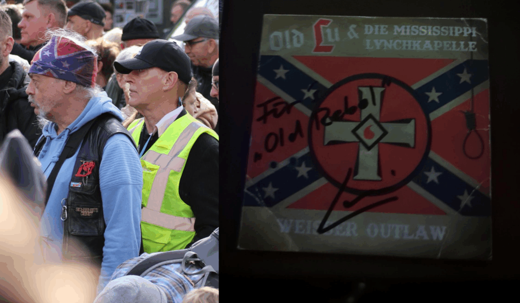 Mit Marc Koppe schließt sich der Kreis nach Leipzig, schließlich zog er um 2021 in die Messestadt und fand einen Arbeitsplatz im „Felsenkeller“ im Leipziger Westen. Auch wenn er seit Sommer 2025 dort nicht mehr angestellt ist und mittlerweile laut eigenen Angaben im Altenburger Land (Thüringen) lebt, ist er immer noch regelmäßig im „Felsenkeller“ vor und hinter der Bühne anzutreffen. Wenn er dort nicht ist, spielt Koppe auch gern mal in der Kneipe „Old Rebel“ auf der Zschocherschen Straße Dart. Die im Südstaaten-Stil gehaltene Bar wird von Alexander Meyer betrieben, der selbst mit einer Reenactment-Gruppe jährlich den amerikanischen Bürgerkrieg nachspielt. In seiner Kneipe prahlt Meyer damit, dass er zu den Halloween-Feiern im „Old Rebel“ im Outfit der rassistischen Organisation „Ku Klux Klan“ hinter dem Tresen steht. Dort liegen auch etliche CDs einschlägig bekannter RechtsRock-Bands. Die Widmung „Für ‚Old Rebel‘ – Lunikoff“ steht etwa auf einer CD der Band „Old Lu & die Mississippi Lynchkapelle“ um den ehemaligen „Landser“-Sänger Michael „Lunikoff“ Regener aus Berlin. Regelmäßig habe er laut eigenen Verlautbarungen, die Konzerte von „Lunikoff“ besucht. Bilder zeigen Meyer darüber hinaus auf einem AfD-Aufmarsch in Berlin im Oktober 2022.