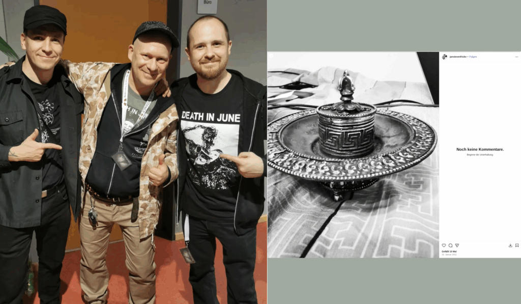Begleitet wurde „Death In Rome“ im „Felsenkeller“ im Januar 2025 vom Musiker Miro Snejdr alias „Herr Lounge Corps“, eine umtriebige Gestalt in der rechten Neofolk-und Black Metal-Szene. Angekündigt war dieser nur als „Special Guest“, wahrscheinlich um mögliche Kritik im Vorfeld des Konzerts zu unterbinden. Ein kurzer Blick ins Social Media-Profil von Snejdr bzw. „Herr Lounge Corps“, gibt einen Blick in eine extrem rechte Weltanschauung frei, die in einem Kulturbetrieb wie dem „Felsenkeller“ nichts verloren hat. Immer wieder macht der Künstler Anspielungen auf rechte Szene-Codes und posiert darüber hinaus mit Protagonist_innen der rechten Neofolk-Szene. Ein Bild zeigt ihn auch mit Douglas Pearce, der mit seinem Projekt „Death In June“ musikalisch und politisch als Wegbereiter der Szene gilt. Snejdr wirkte mehrfach auf Produktionen von „Death In June“ mit.